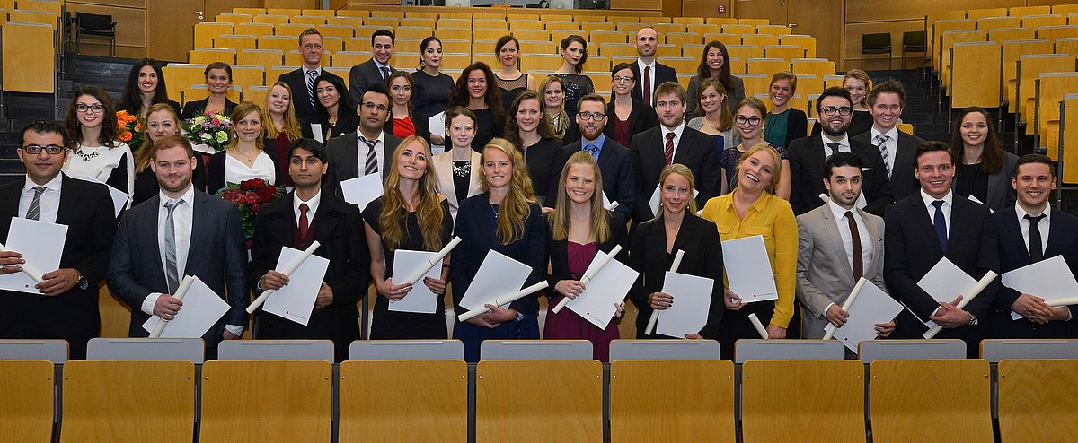 Das Foto zeigt die Absolventinnen und Absolventen des Studiengangs Zahnmedizin, die am Samstag im Hörsaal Chirurgie der Universitätsmedizin Mainz ihr Zeugnis erhielten. Foto: Uwe Feuerbach