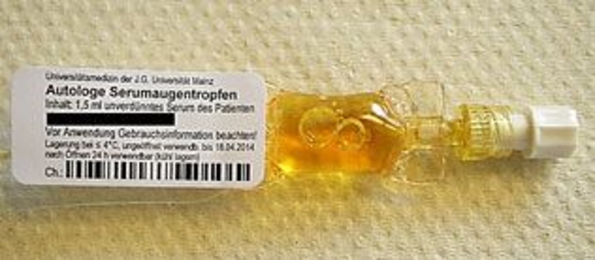 Seit März 2013 stellt die Transfusionszentrale autologe Serumaugentropfen in Zusammenarbeit mit der Augenklinik der Universitätsmedizin Mainz für Patienten der Universitätsmedizin Mainz sowie auswärtiger Krankenhäuser und niedergelassener Ärzte her. Sie finden in der Therapie des schwer trockenen Auges Anwendung – beispielsweise nach Verbrennungen oder Verätzungen – ebenso wie bei der Therapie der superioren limbalen Keratokonjunktivitis (SLK) oder der Graft-versus-host-Erkrankung. Sie stellen hier oft die einzig wirksame Behandlung dar. Die Transfusionszentrale der Universitätsmedizin Mainz gehört zu den wenigen Zentren in Deutschland, die eine Herstellungserlaubnis für autologe Serumaugentropfen besitzen. Autologe Serumaugentropfen werden aus Eigenblut hergestellt und enthalten keine weiteren Zusätze.