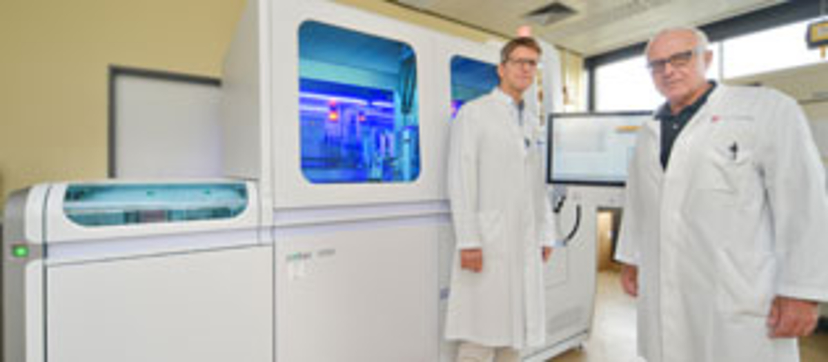 Bildunterzeile: Der Direktor der Transfusionszentrale, Professor Walter Hitzler, und sein Mitarbeiter Stefan Runkel nutzen jetzt ein leistungsfähigeres Hightech-Gerät zur Diagnostik von Blutspenden.